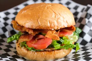 Bacon, lettuce & tomato on an artisan roll with garlic mayo.