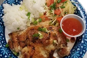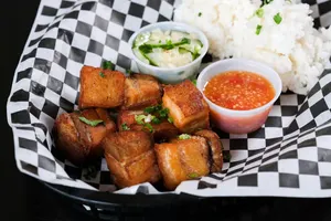 Pork belly, slow roasted then fried crisp served with Thai chili garlic sauce & cucumber salad and your choice of rice or French fries.