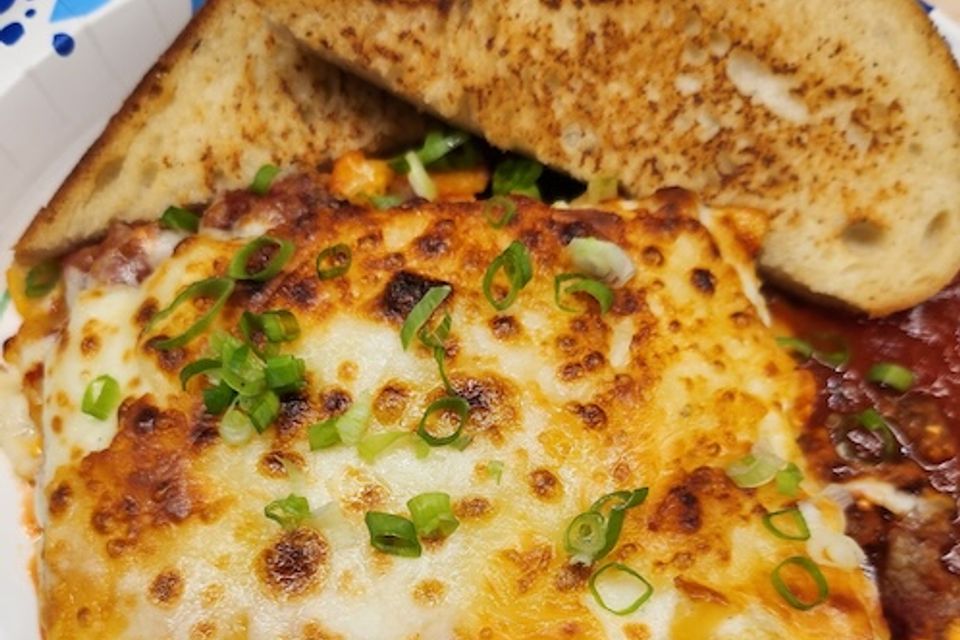 Caramelized onions cooked in beef broth, topped with croutons, melted provolone and swiss cheese.