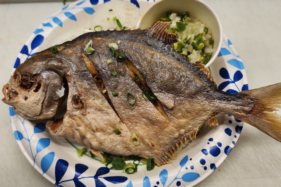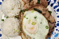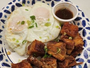 Pork belly, slow roasted & fried crisp served with rice & 2 eggs.