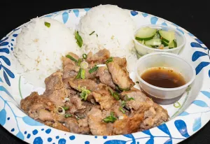 Pork shoulder sliced thin and marinated with classic Thai flavors and cooked on the flat grill. Served with rice, cucumber salad & chili vinegar sauce.