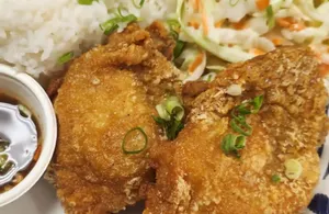 Boneless chicken thighs fried crisp served with mild sauce, steamed rice & creamy coleslaw.